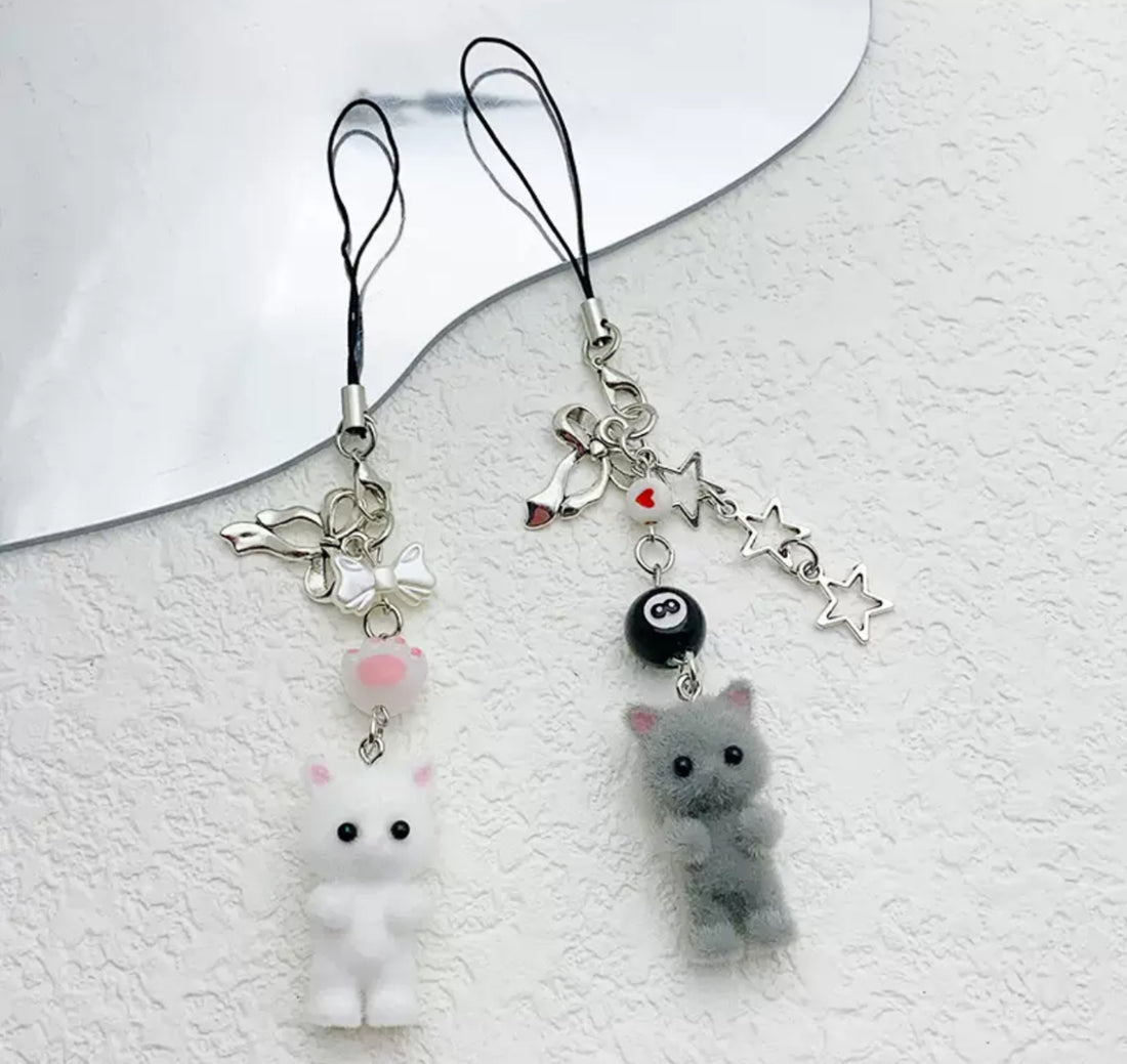 Cat Charm Keychain This stylish accessory combines elegance and cuteness: a silver bow, playful cubes,...