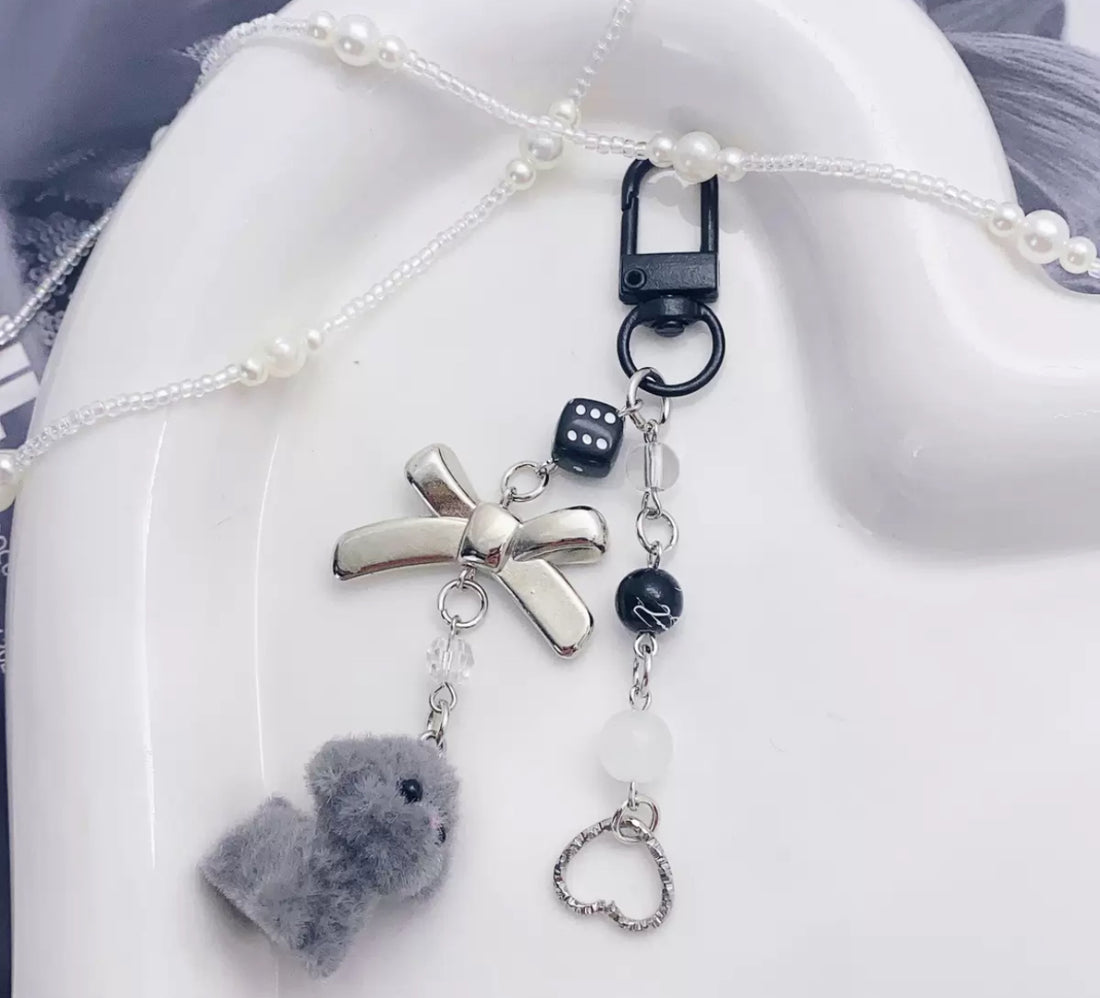 Gray Puppy Keychain with Pendant This stylish accessory combines elegance and cuteness: a silver bow,...