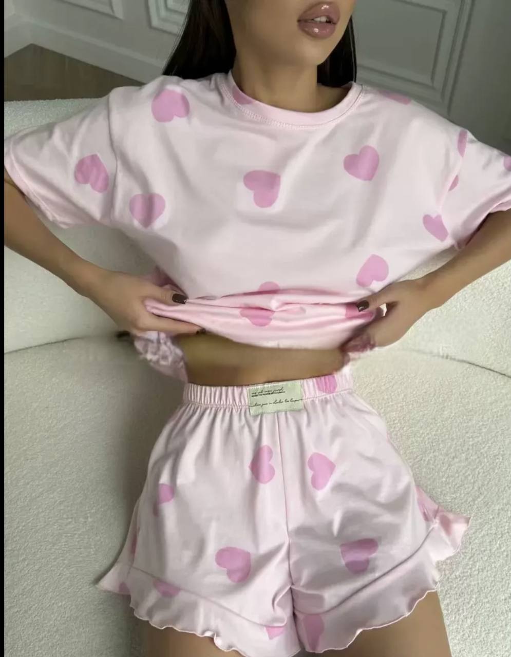 Lighthearted Heart-Print Pajama Set (T-Shirt + Shorts) Pink