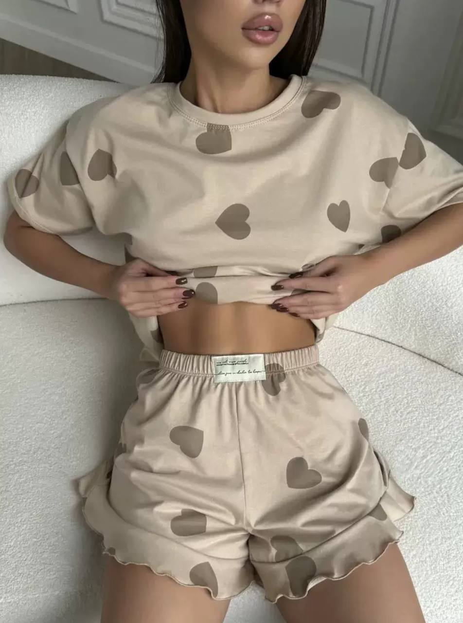 Lighthearted Heart-Print Pajama Set (T-Shirt + Shorts) Mocha