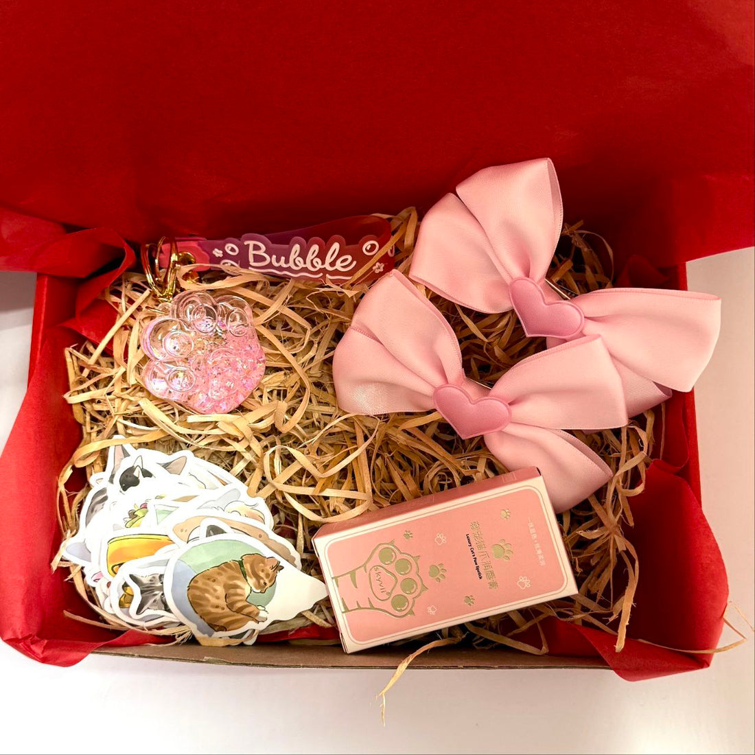 Pink Gift Set for Girls (50 stickers, paw balm, bows, paw-shaped keychain)