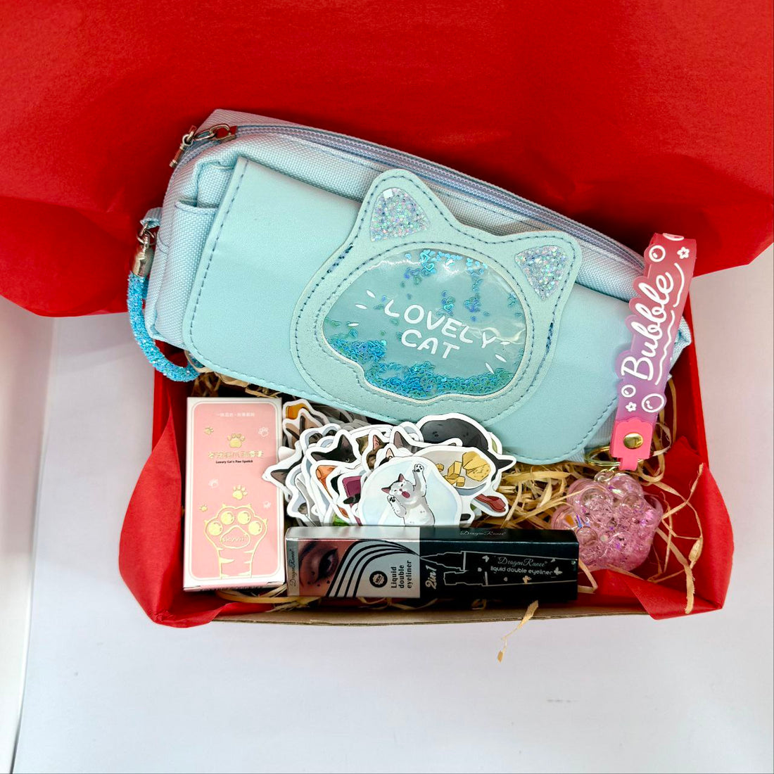 Gift Set for Girls (pencil case, Paw Print keychain, lip balm, 50 stickers, 2-in-1 eye liner)