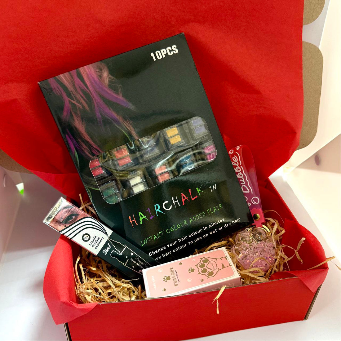 Gift Set for Girls (Hair Chalk, Paw Print Keychain, 2-in-1 Eyeliner, Balm)