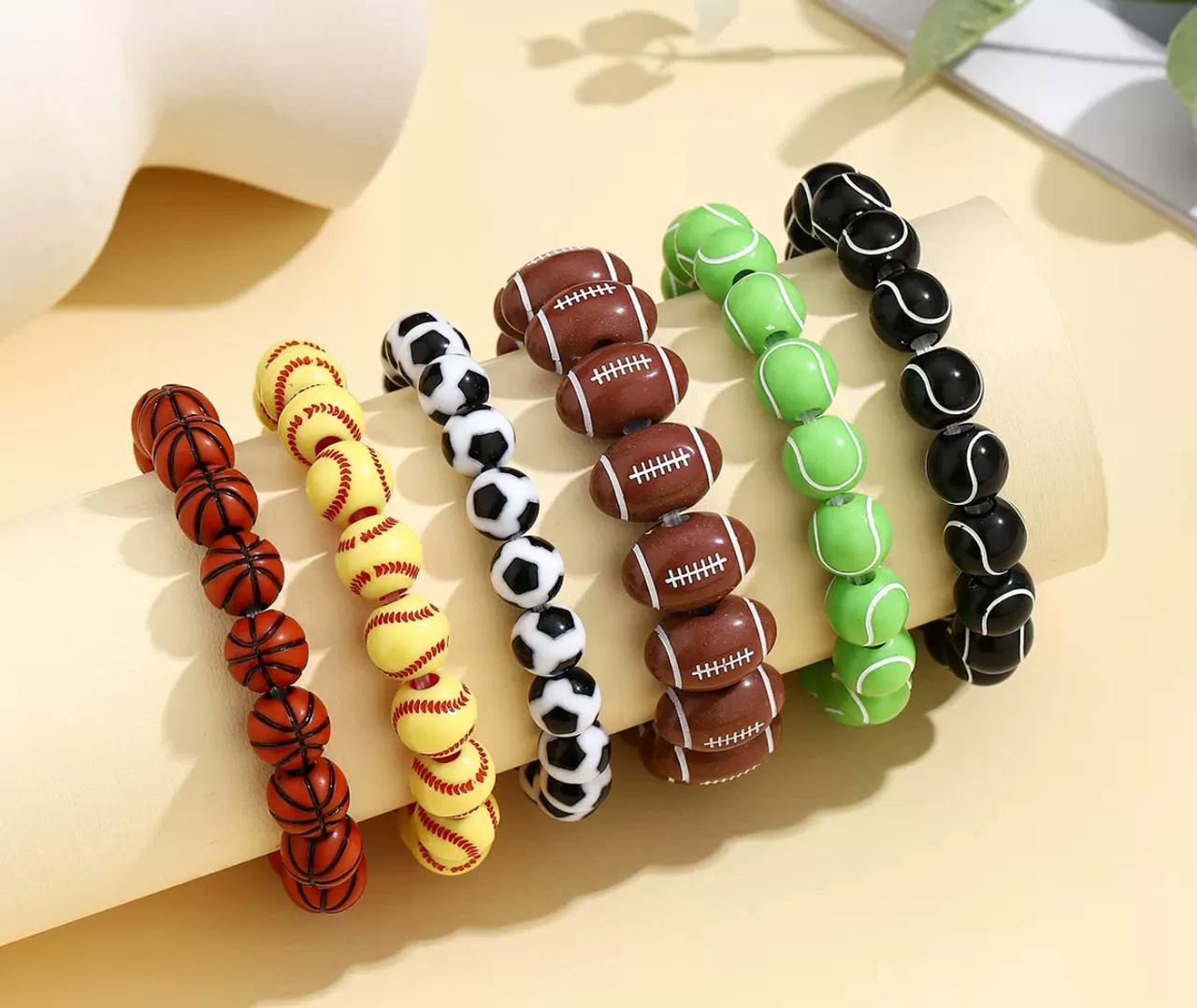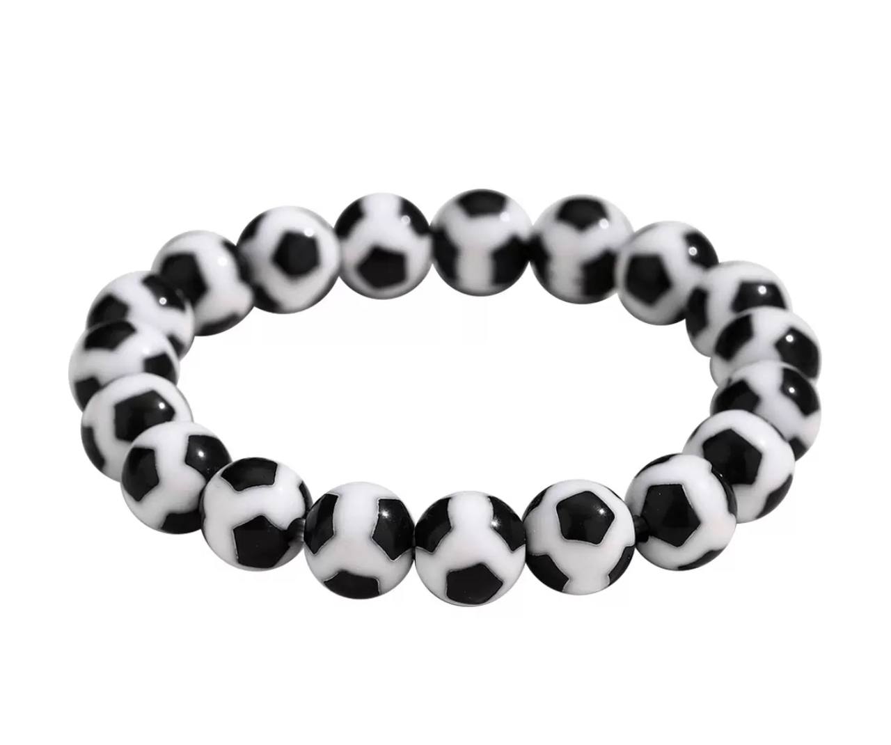 A stretchy bracelet featuring plastic beads shaped like footballs — a vibrant accessory for true soccer fans! Lightweight, comfortable, and elastic, it slips easily onto the wrist and is perfect for everyday wear. This bracelet makes a stylish addition to any outfit and also makes a great gift for anyone passionate about football.
