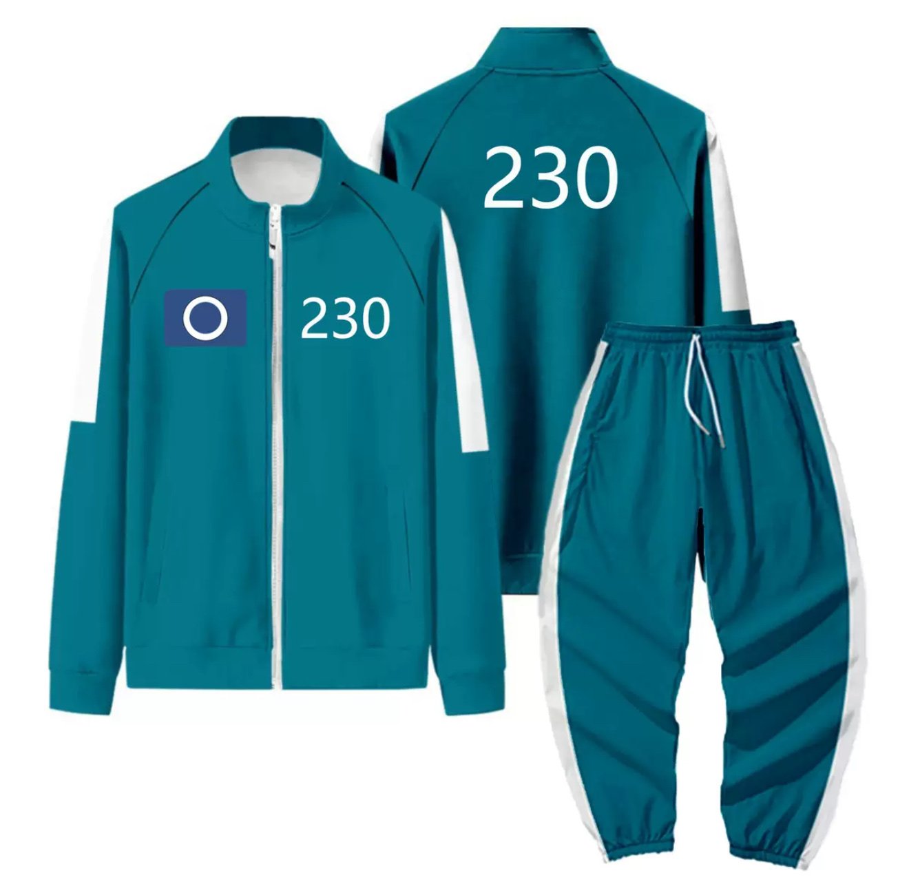 Player Costume No. 230 from the "Squid Game" series — this is a sporty set worn by all participants in the game. It features a simple yet recognizable design and includes the following elements: