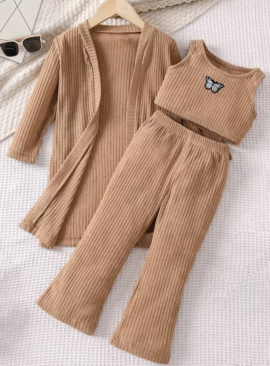 A cozy knit set for girls, perfect for relaxing at home or strolling on cooler days. It includes comfortable leggings, a sleeveless top, and a relaxed-fit cardigan. Made from soft, textured fabric that feels gentle to the touch and allows free movement. The elastic waistband ensures a snug fit, while the stylish cut adds a modern, comfortable touch to her look.