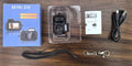- Package includes: camera, USB charging cable, user manual, wrist strap, and carabiner.
