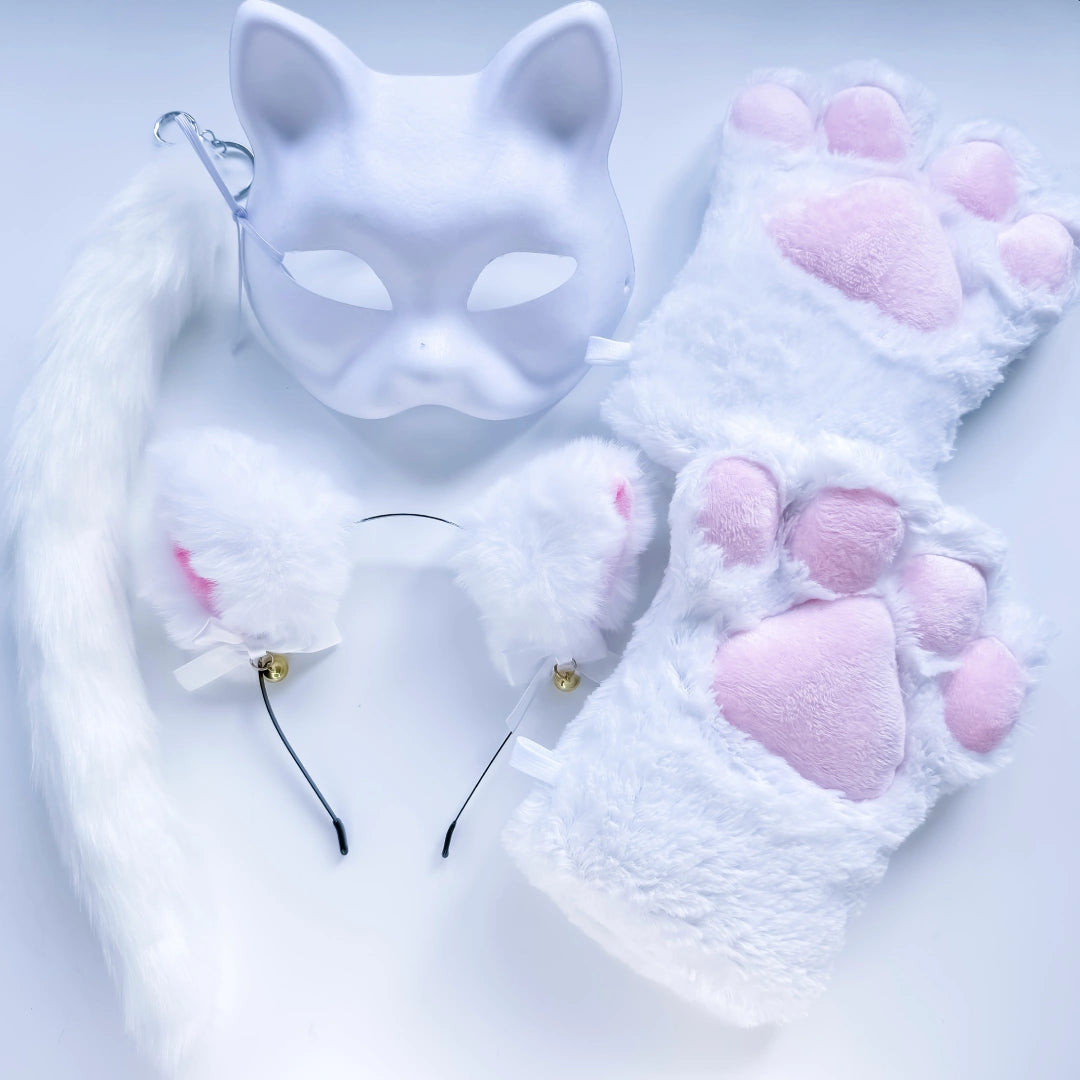 Quadrobics Costume Set (Decorative Mask, Large Paws, Ears, and Claw-Clip Tail) - White