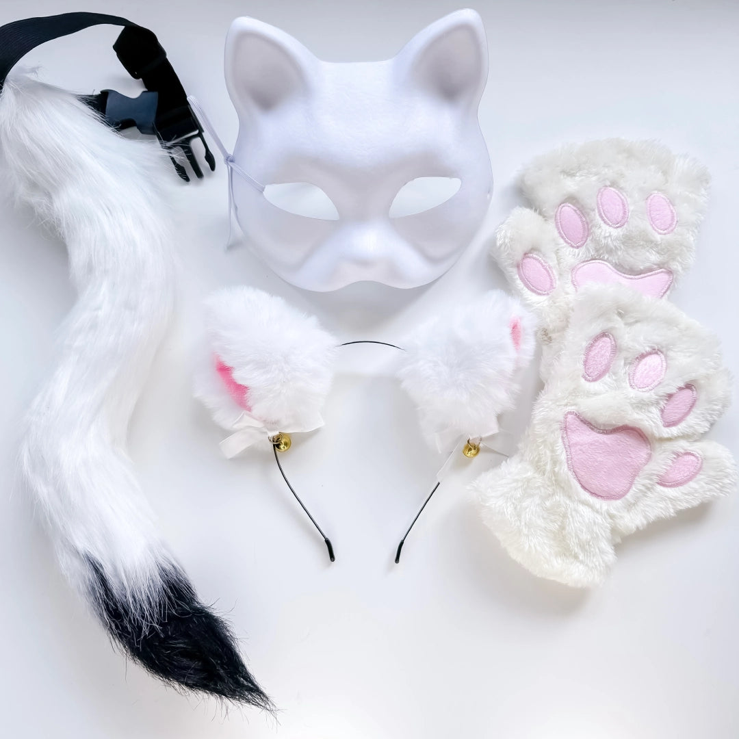 Quadrobics Costume Set (Decorative Mask, Paws, Ears, and Tail on a Strap) - White