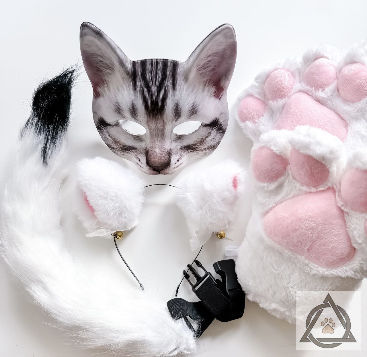 Quadrobics Costume Set (Mask, Large Paws, Ears, Tail on Strap) White