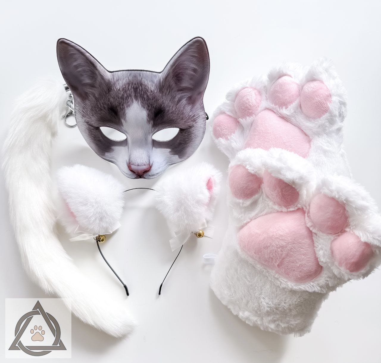 Quadrobics Costume Set (Mask, Large Paws, Ears, Tail with Carabiner) White