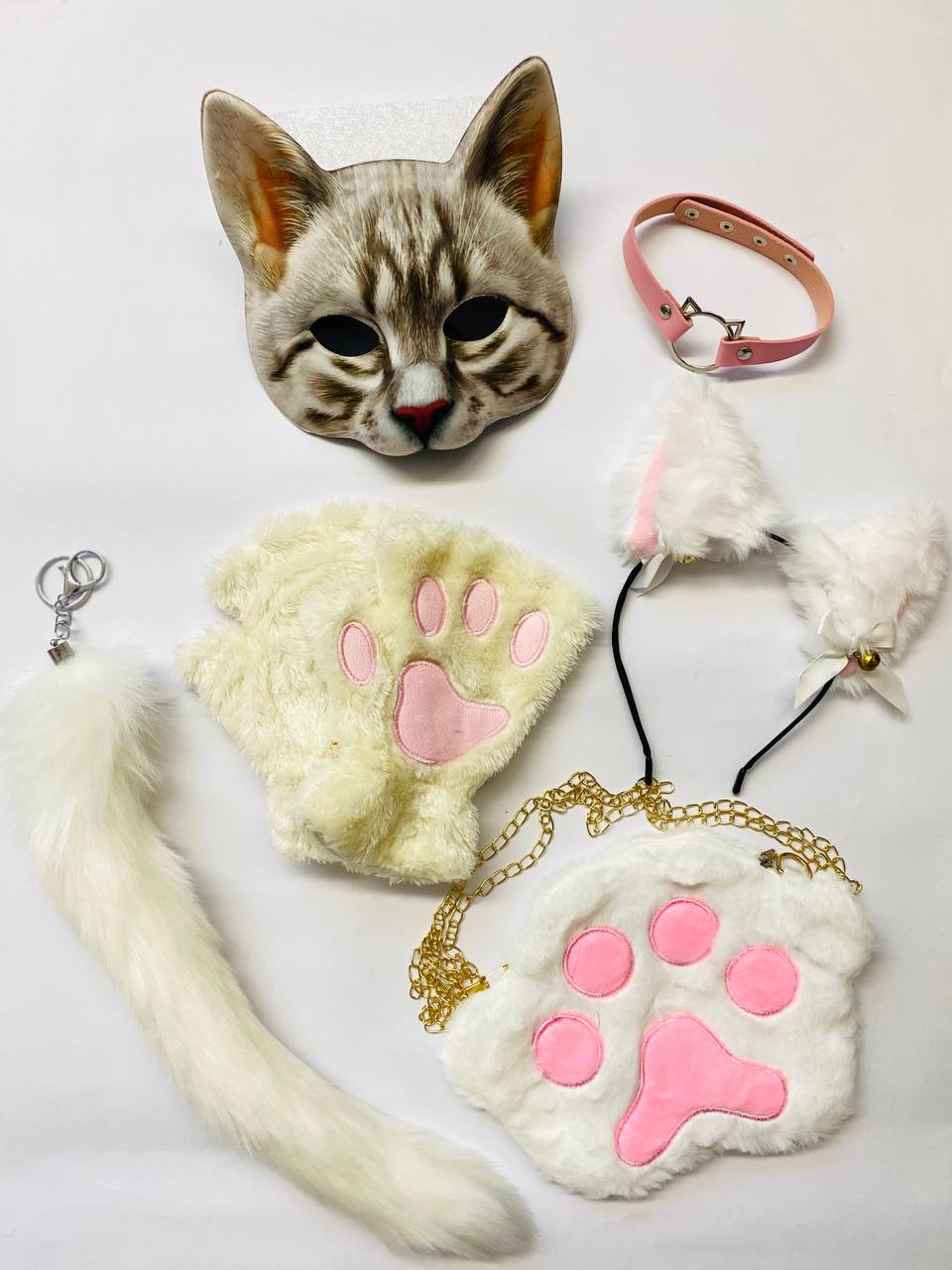 Quadrobics Set (mask, paws, ears, tail on a carabiner, choker, bag) White and Pink
