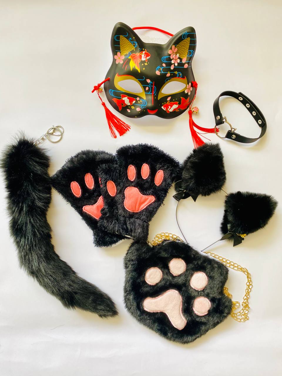 Quadrobics Costume Set (mask, paws, ears, tail with carabiner, choker, bag) Black