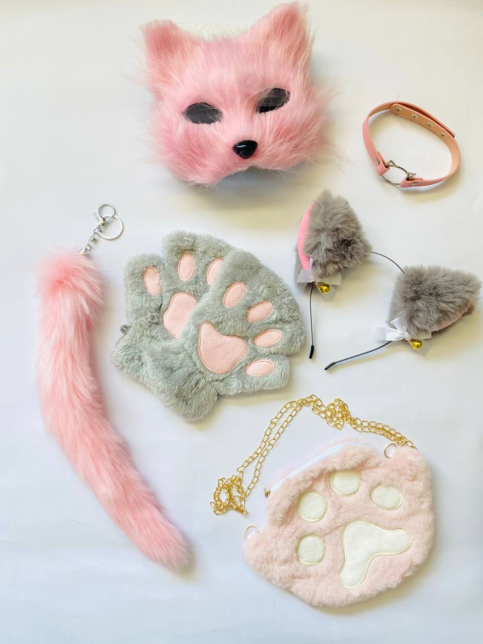 Quadrobics Set (mask, paws, ears, tail on a carabiner, choker, bag) in Pink and Gray