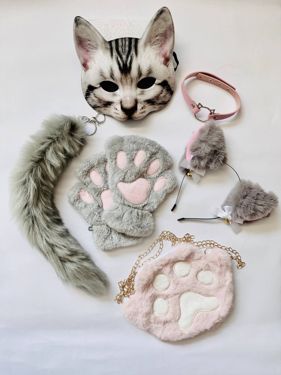 Quadrobics Set (mask, paws, ears, tail with carabiner, choker, bag) in Gray-Pink
