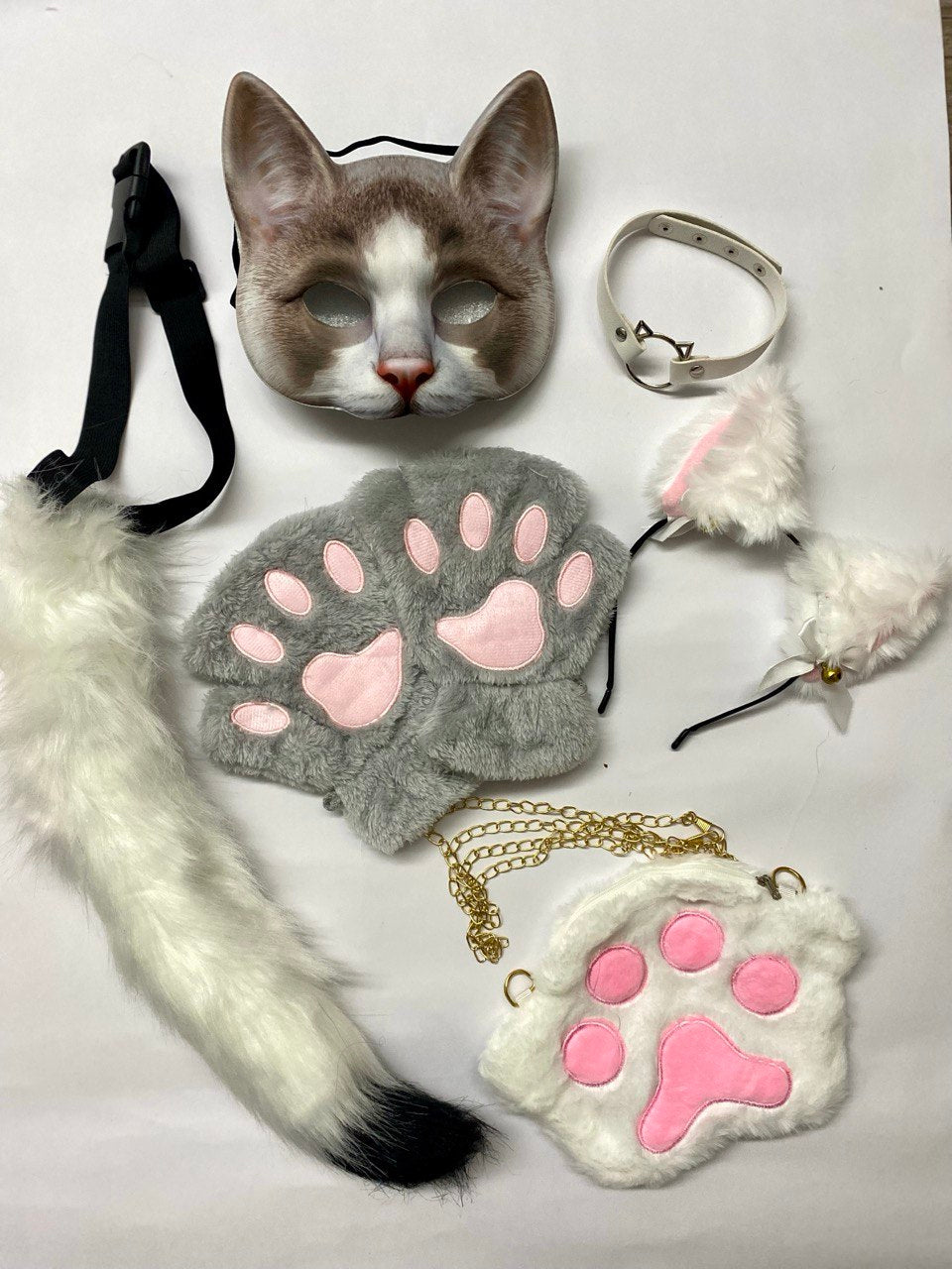 Quadrobics Set (mask, paws, ears, tail on a strap, choker, bag) in White and Gray