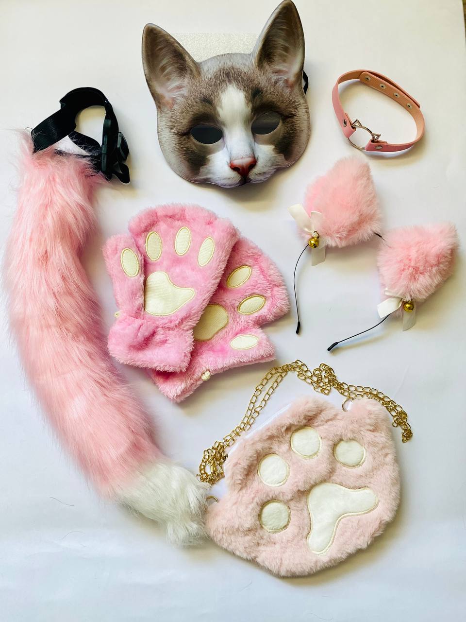 Quadrobics Set (mask, paws, ears, tail on a strap, choker, bag) - Pink