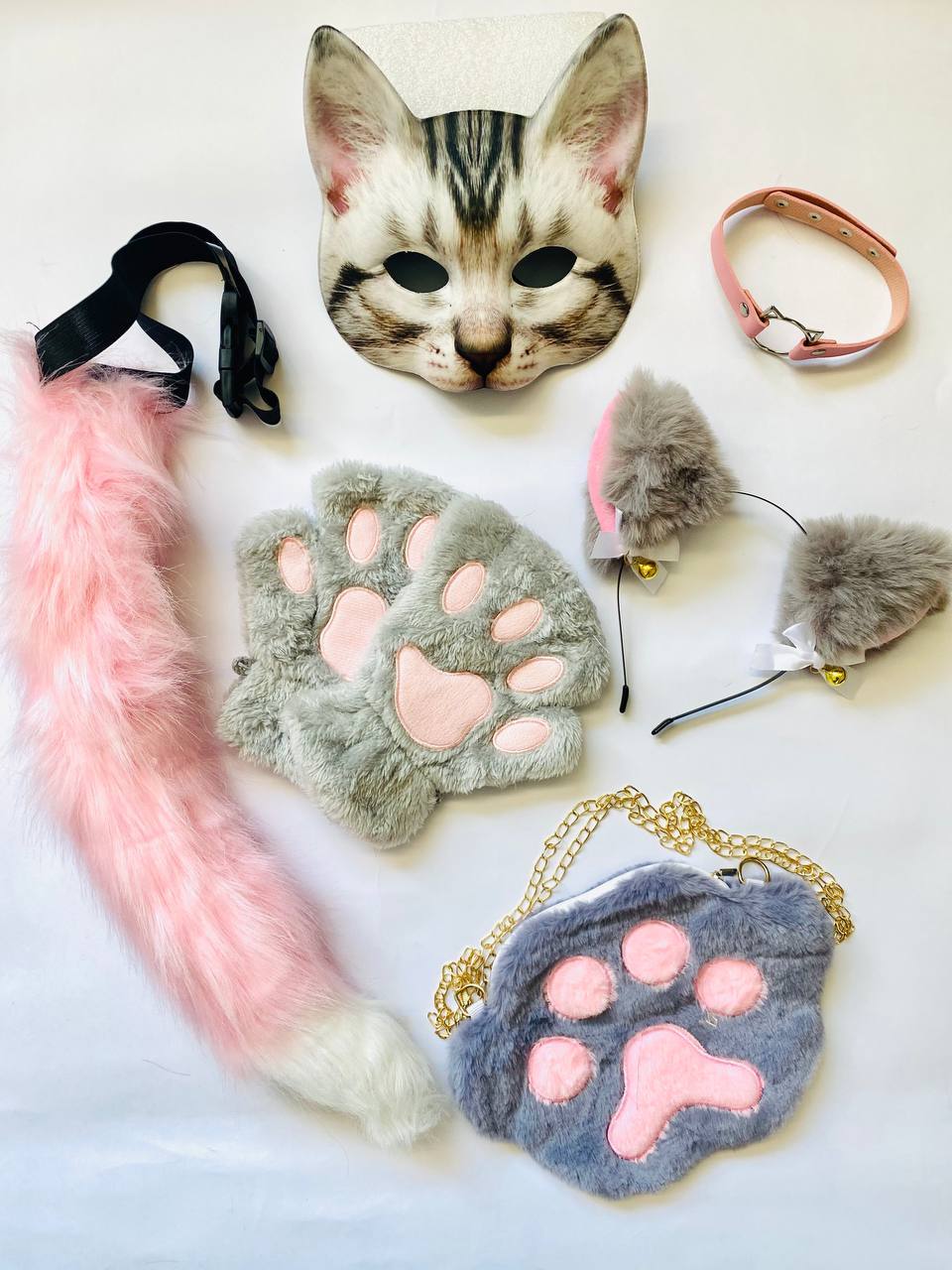 Quadrobics Play Set (mask, paws, ears, tail on a strap, choker, bag) in Gray-Pink