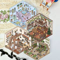 This charming illustration features four hexagonal rooms, each serving a different purpose. Adorable animal-like characters bring the space to life, adding warmth and coziness to the scene.