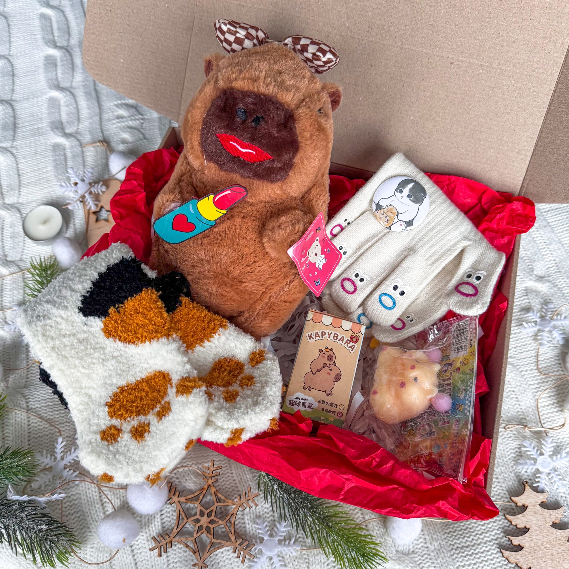 A perfect gift for any celebration, this set is ideal for both girls and boys. It includes all the popular items that kids and tweens will love: a soft 20cm plush toy (with a wide selection), fluffy paw-print socks (available in many colors), a surprise-box keychain, a squishy hamster, touch-screen gloves (white or black), and a 44mm badge.