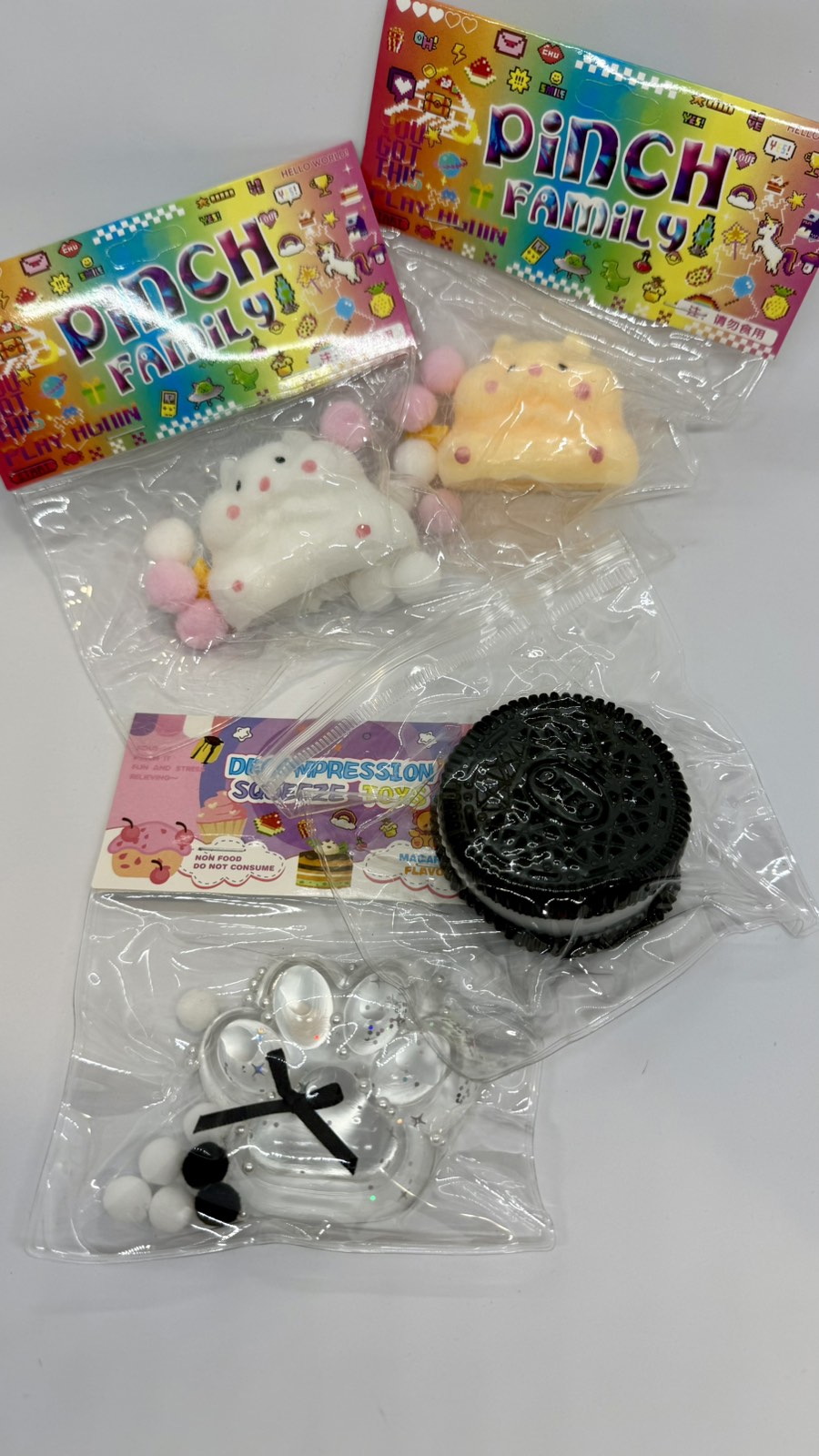 This squish set is the perfect solution for stress relief and mood boosting. Its soft, elastic texture feels pleasant to the touch and is highly responsive to squeezing. The squish will help you relax and unwind after a long day. Compact enough to fit in your bag or on your desk, so it's always within reach whenever you need a moment of calm. This set makes a wonderful and popular gift for children of all ages. Included are: one 7cm paw, two hamsters, and one Oreo.