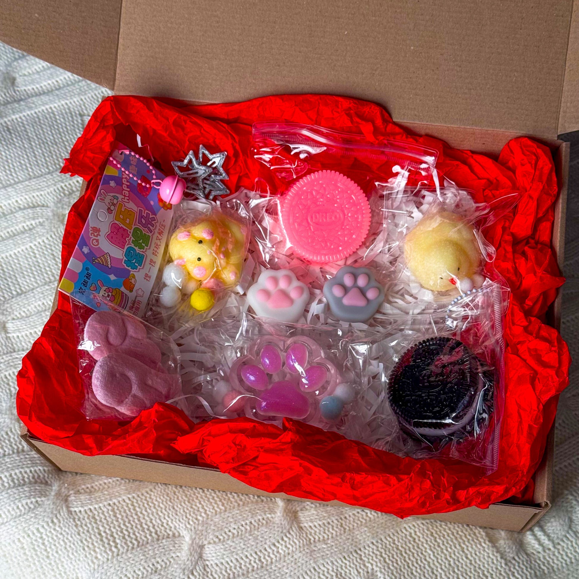 This squish set is the perfect solution for stress relief and mood boosting. Its soft, stretchy texture feels pleasant to the touch and is highly responsive to squeezing. Squishies help you relax and unwind after a long day. Compact enough to fit in a bag or on your desk, so you'll always have a moment of calm at your fingertips. This set makes a wonderful and popular gift for children of all ages. Included are: Oreo squish, hamster, chick, a 7cm paw, two 4cm paws, and a set of Wing Clips.