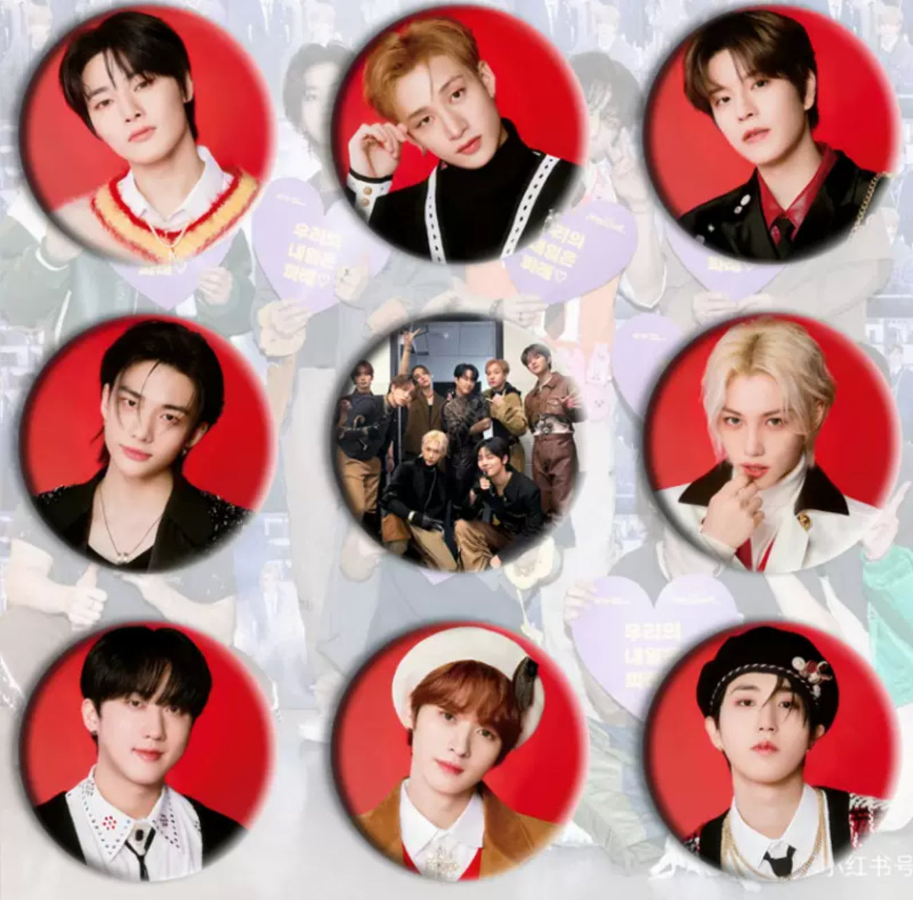 Dive into the world of Korean music and idols with this badge set inspired by your favorite group members. The collection includes 9 unique badges featuring images of the artists in various looks—sure to delight K-pop fans.