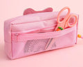 This stylish and practical pencil case will quickly become a favorite accessory for students and kids alike. With its spacious design, it comfortably holds pencils, pens, scissors, and other essentials. The unique design features plush cat ears and a transparent glitter insert that’s sure to catch the eye.