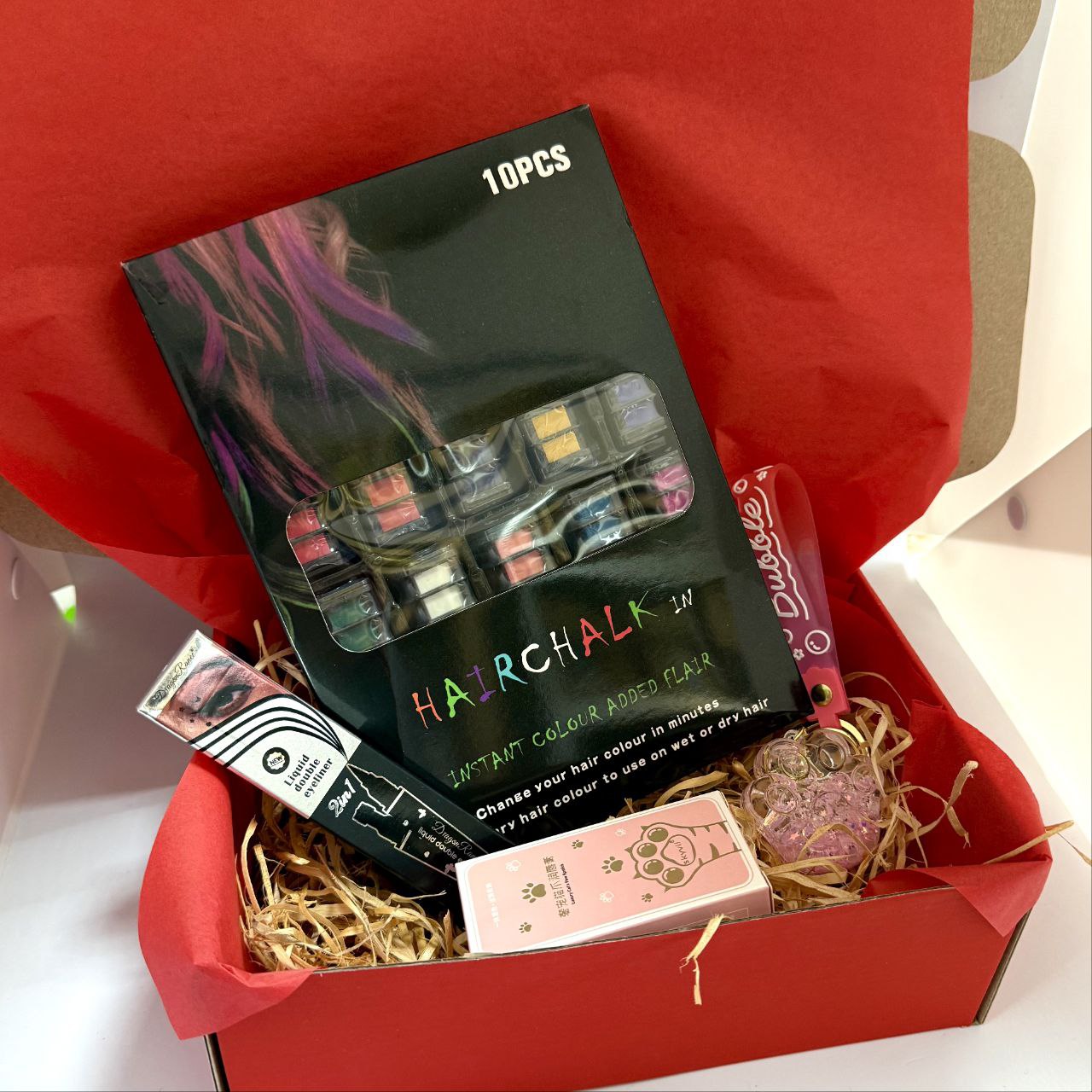 Looking for a stylish and versatile gift to delight friends or loved ones? Our gift set is the perfect blend of practicality, elegance, and care. It includes carefully selected items that make a delightful surprise as a present. The set features: hair chalk in 10 vibrant colors, a glittery paw print keychain, Paw Balm, a 2-in-1 eye liner with a stamp (star/heart).