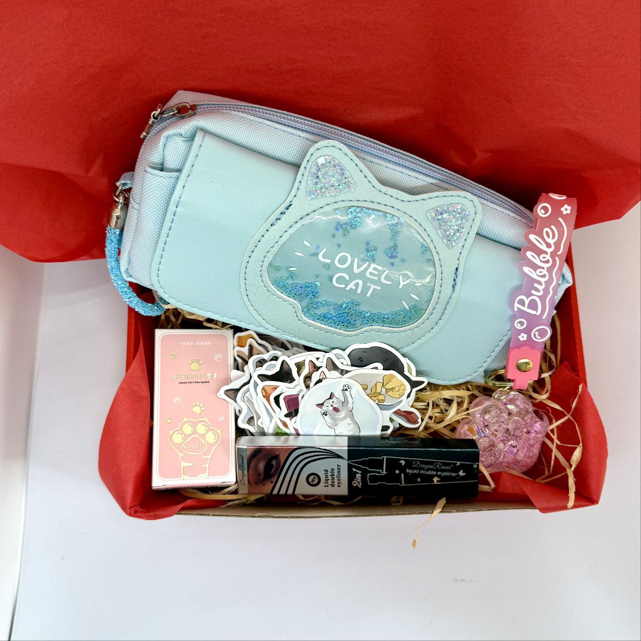 Gift Set for Girls (pencil case, Paw Print keychain, lip balm, 50 stickers, 2-in-1 eye liner)