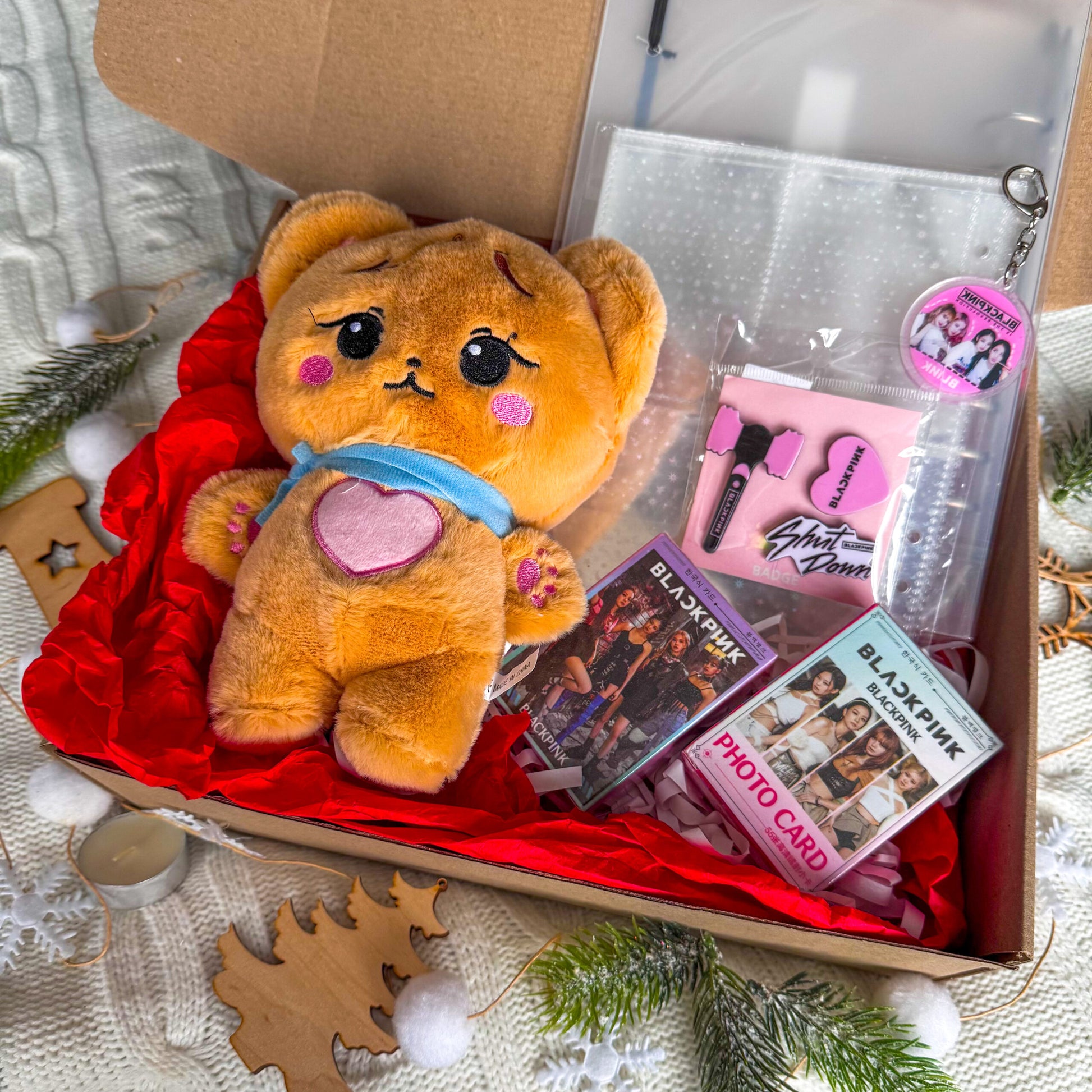 This set includes collectible items that let you show your love for Black Pink. It makes a perfect gift for any fan of the group or K-pop music in general. The set features: a 25cm plush toy, two holographic card sets with 55 cards each, a ring binder for cards with holographic inserts, an acrylic keychain, and a set of pins.