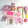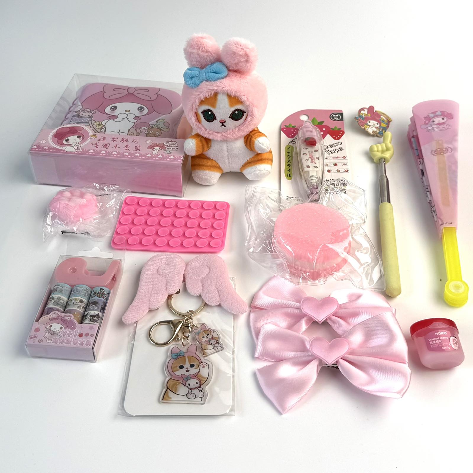 Looking for a stylish and versatile gift to delight friends or loved ones? Our gift set is the perfect blend of practicality, elegance, and thoughtfulness. It includes carefully selected items that make a delightful surprise as a present. Specifically: a soft plush keychain, a notebook with a marker, a badge, a finger pointer, Melody fan, Oreo squish toy and paw, acrylic keychain, mini tape set, phone grip with suction cup, hair clips, lip balm, and a tape liner.
